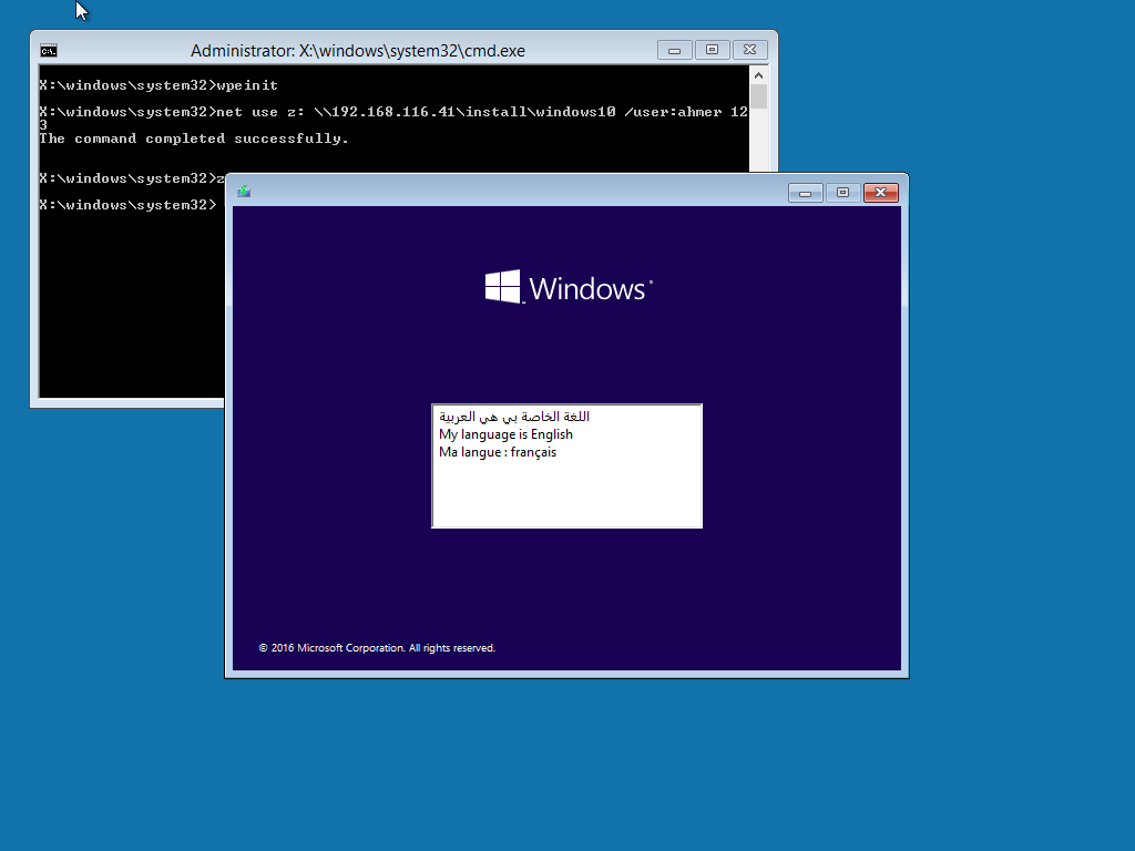 wpeinit net use z: \\192.168.116.41\install\windows10 /user:ahmer 123 z:\setup.exe